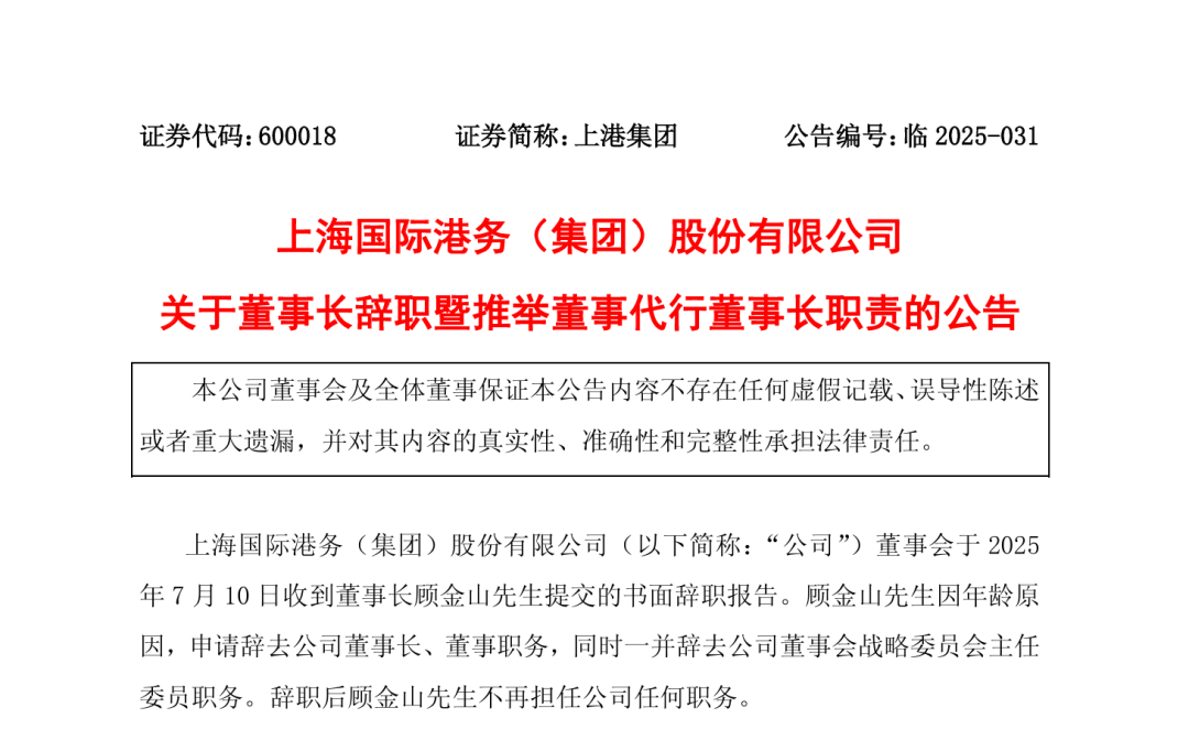 7月11日股市融资什么意思,上港集团(600018)发布《关于董事长辞职暨推举董事代行董事长职责的公告》,上港集团董事会于2025年7月10日收到董事长顾金山提交的书面辞职报告。顾金山因年龄原因,申请辞去公司董事长、董事职务,同时一并辞去公司董事会战略委员会主任委员职务。辞职后顾金山不再担任公司任何职务。